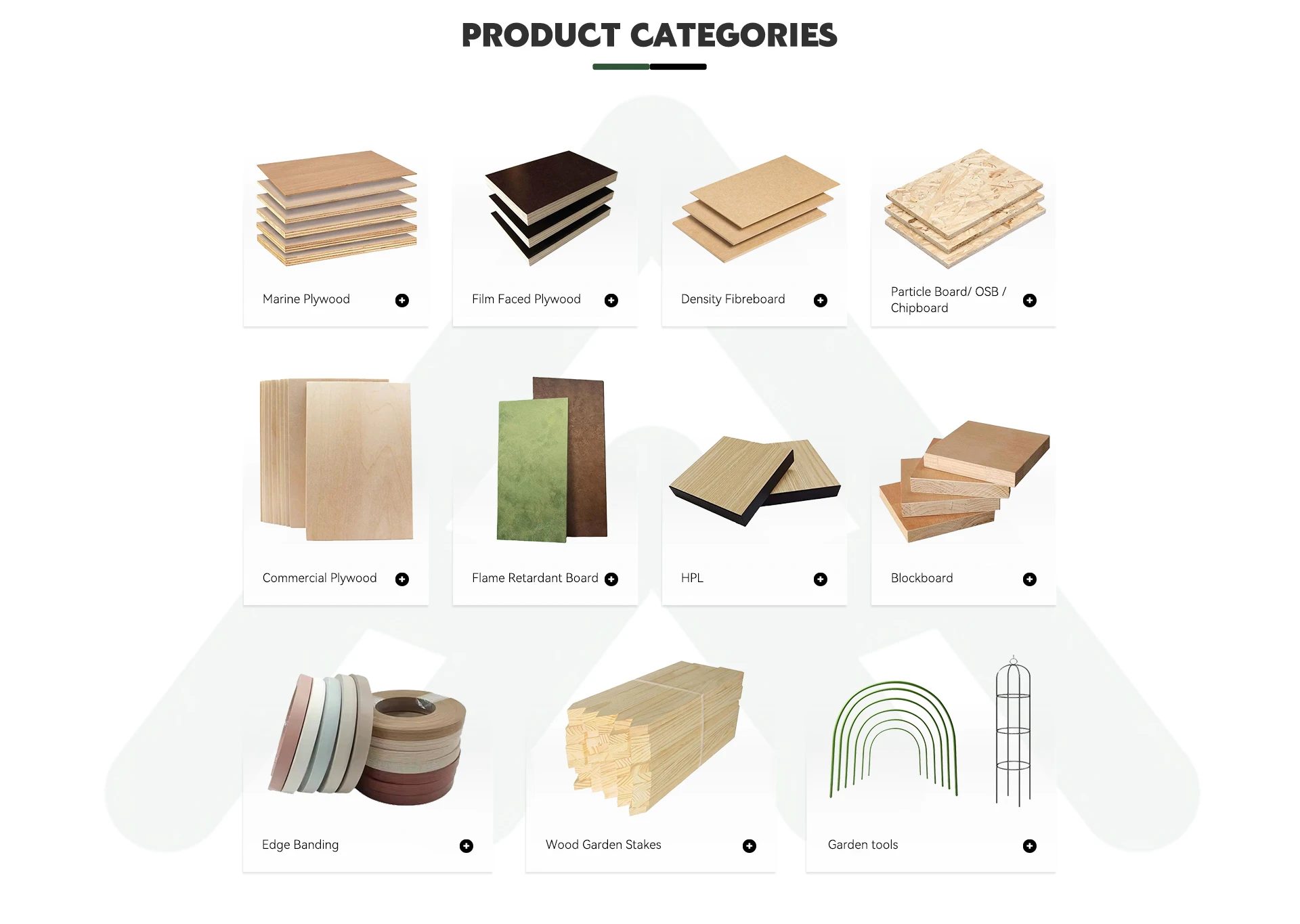 Main categories: Plywood, Film Faced Plywood, MDF, Fire-Proof Board, Particle Board